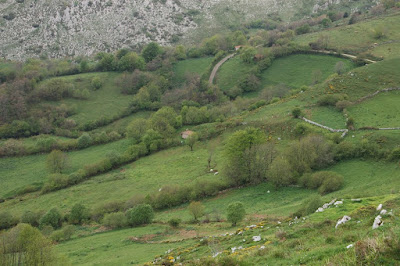 Llegamos ahora a la braña de Cagachoneiro (1.430m) donde encontramos restos de pequeñas construcciones para el ganado, cogemos dirección noroeste hasta llegar a la Vega de Fompedrín donde podemos apreciar una pequeña laguna que sirve de abrevadero para el ganado, desde este punto ya podemos apreciar a lo lejos el aparcamiento de la cima del Angliru donde ya empezaba a entrar la niebla que mas tarde nos acompañaría hasta el final de la ruta.
